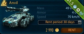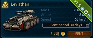 | Level | 3(VIP) | | Armor | 4,000 | | Weight | 38,000 | | Cost of studies | N/A | | Renting 3 days | 1,200 Gold | | Renting 10 days | 2,700 Gold | | Renting 30 days | 2,990 Gold | | Renting forever | Unavailable | | Cost of sales | Not for sale |